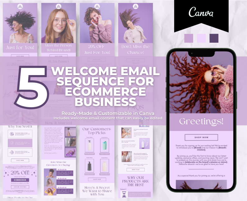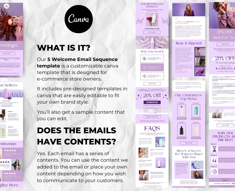 Our 5 Welcome Email Sequence template is a customizable canva template that is designed for e-commerce store owners. It includes pre-designed templates in canva that are easily editable to fit your own brand style. You’ll also get a sample content that you can edit.