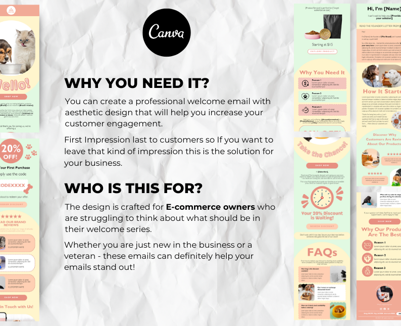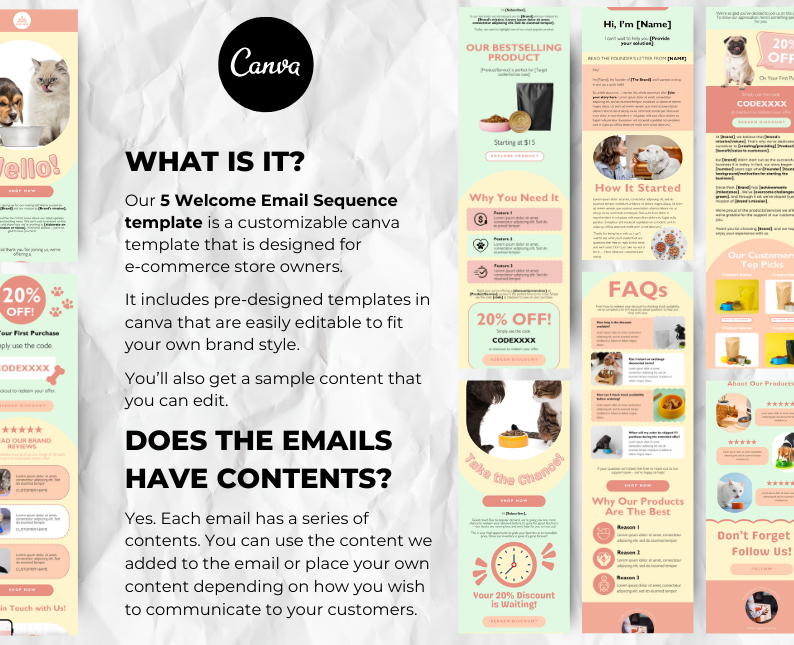 Our 5 Welcome Email Sequence template is a customizable canva template that is designed for e-commerce store owners. It includes pre-designed templates in canva that are easily editable to fit your own brand style. You’ll also get a sample content that you can edit.