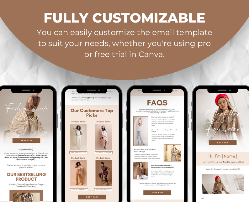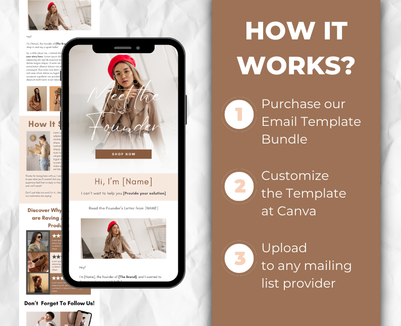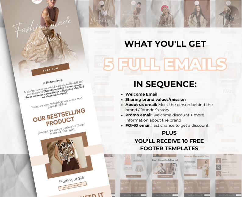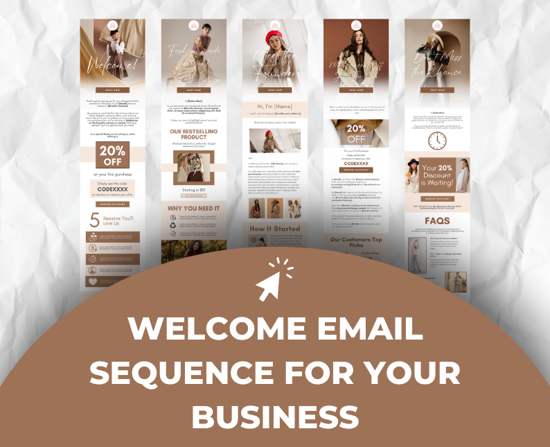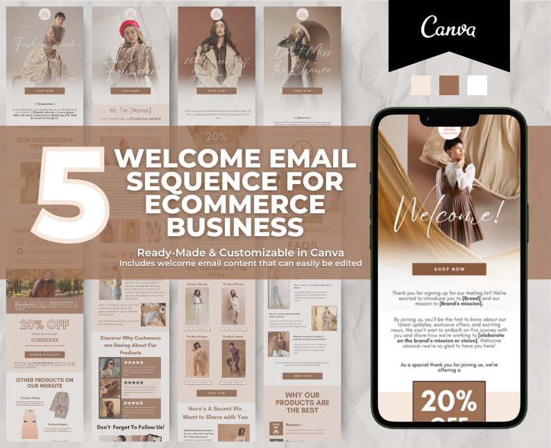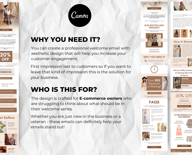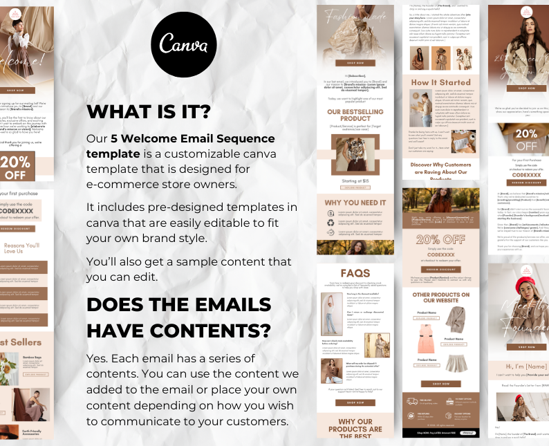 Our 5 Welcome Email Sequence template is a customizable canva template that is designed for e-commerce store owners. It includes pre-designed templates in canva that are easily editable to fit your own brand style. You’ll also get a sample content that you can edit.