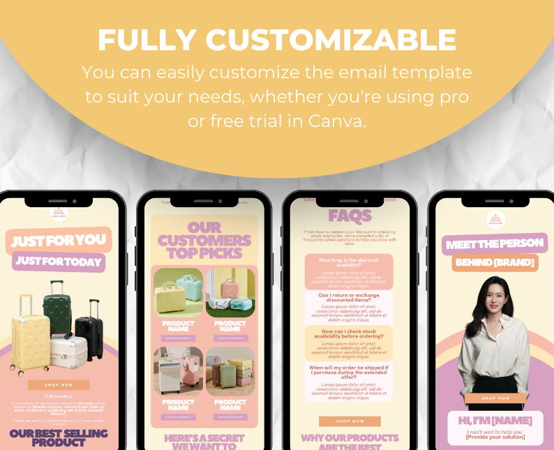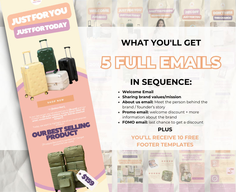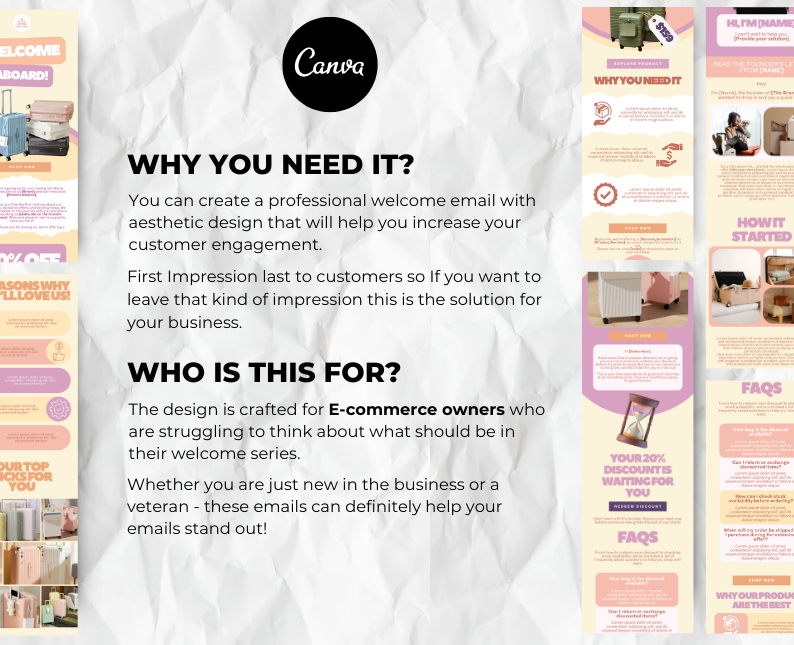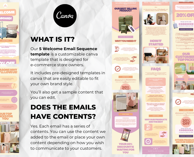 Our 5 Welcome Email Sequence template is a customizable canva template that is designed for e-commerce store owners. It includes pre-designed templates in canva that are easily editable to fit your own brand style. You’ll also get a sample content that you can edit.